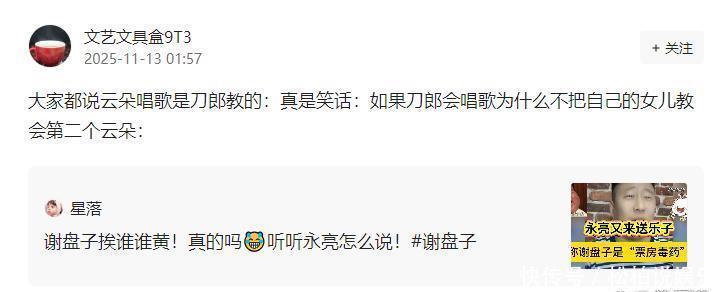 还有人质疑,大家都说她唱歌是刀郎教的,这简直是笑话。如果刀郎会唱歌,为什么不把自己的女儿培养成第二个她?这种逻辑,简直荒谬至极。每个孩子都有自己的天赋和成长轨迹,不能因为刀郎没有把女儿培养成歌手,就否定他对她的教导和付出。